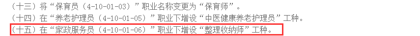 近幾年在國內(nèi),整理收納行業(yè)逐漸興起,被國家相關(guān)機(jī)構(gòu)重視,并逐漸建立健全整理收納行業(yè)相關(guān)標(biāo)準(zhǔn)和相關(guān)職業(yè)規(guī)劃體系。2021年1月15日,在人社部網(wǎng)站公示的《關(guān)于對(duì)擬發(fā)布集成電路工程技術(shù)人員等職業(yè)信息進(jìn)行公示的公告》一文中,明確了在“家政服務(wù)”職業(yè)下增設(shè)“整理收納師”工種。