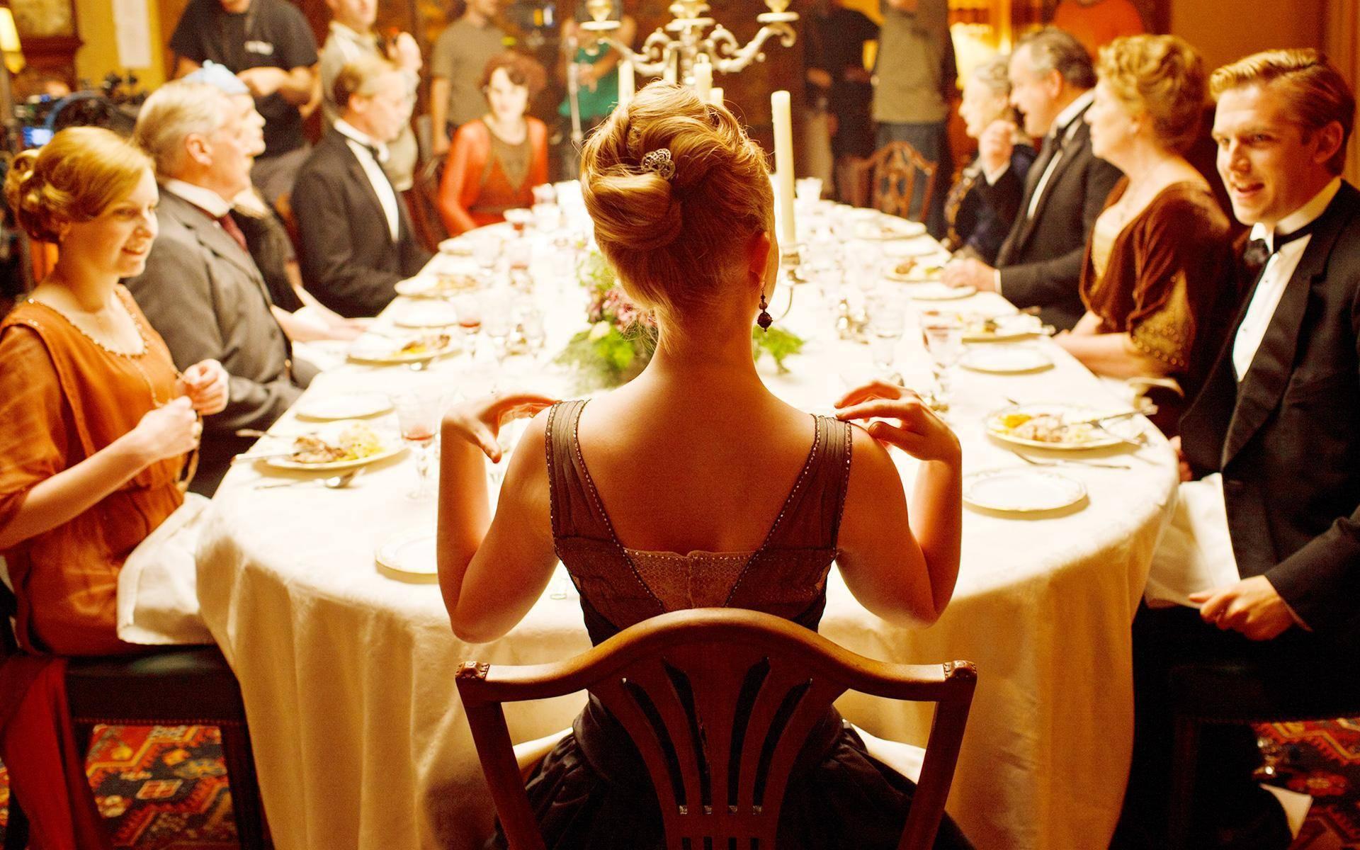 《唐頓莊園》中,餐桌上的客人都是以女士為主,但按照傳統(tǒng),是以男—女—男—女的順序就座。而已婚夫婦則會被分開就坐,因為通常認為他們待在一起的時間已夠長了。