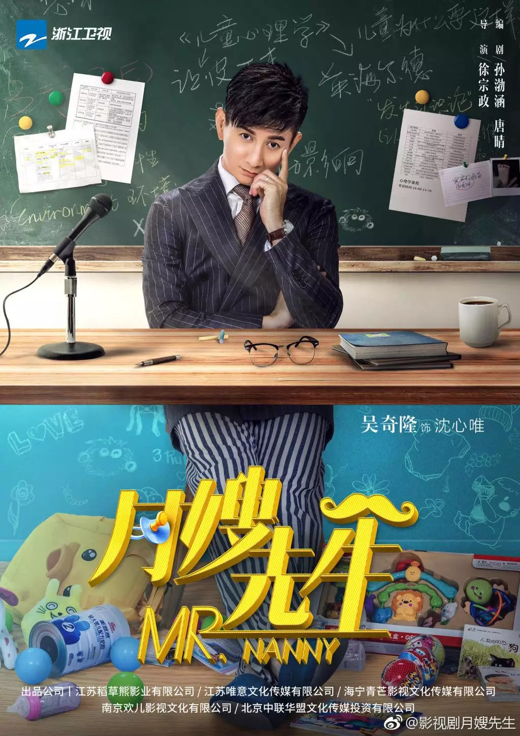 以桌面為分界線,吳奇隆的海報(bào)上半部是象征學(xué)術(shù)和心理學(xué)家的專(zhuān)業(yè)理論、專(zhuān)著、麥克風(fēng)、領(lǐng)帶西裝。