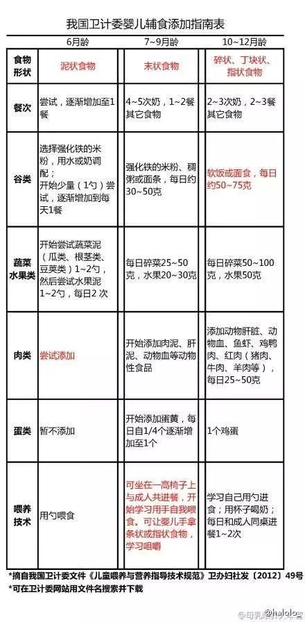 衛(wèi)辦婦社發(fā)〔2012〕49號文件中,給出了《兒童喂養(yǎng)與營養(yǎng)指導技術(shù)規(guī)范》,這是下發(fā)各地衛(wèi)生部門執(zhí)行的文件。換言之,我們帶寶寶去做的兒保,是應當照此指導寶寶的輔食添加的!